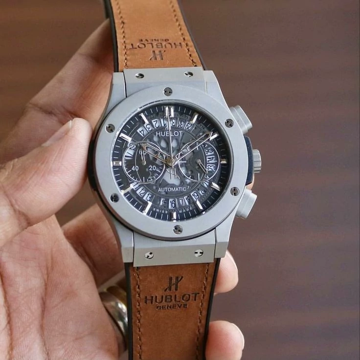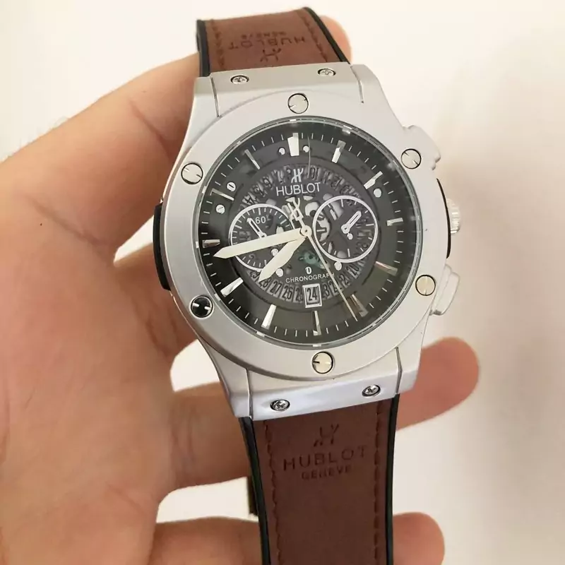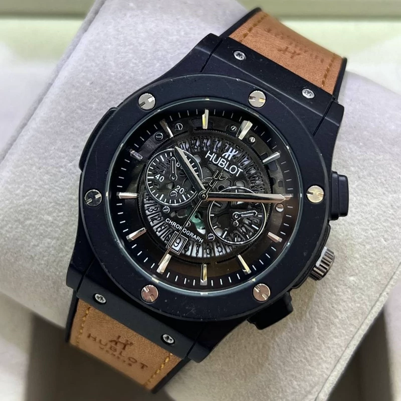 ساعت هابلوت Hublot بند قهوه ای کیفیت درجه یک رنگ ثابت تاریخ دار با جعبه